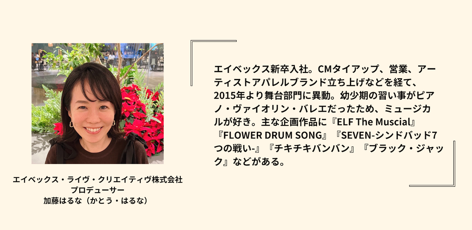2007年、パフォーマンス集団『BLUE MAN GROUP』の招聘をきっかけに、演劇やミュージカルなどのシアター事業にも積極的に取り組んできたエイベックス。自身の経験から入社時は音楽分野に関わり、その後、プロデューサーとして数々のミュージカル作品を手掛けてきた加藤はるなさんに、経費の増大やチケット代の高騰などさまざまな課題とどう向き合っているか、舞台制作者としての思いを伺いました。