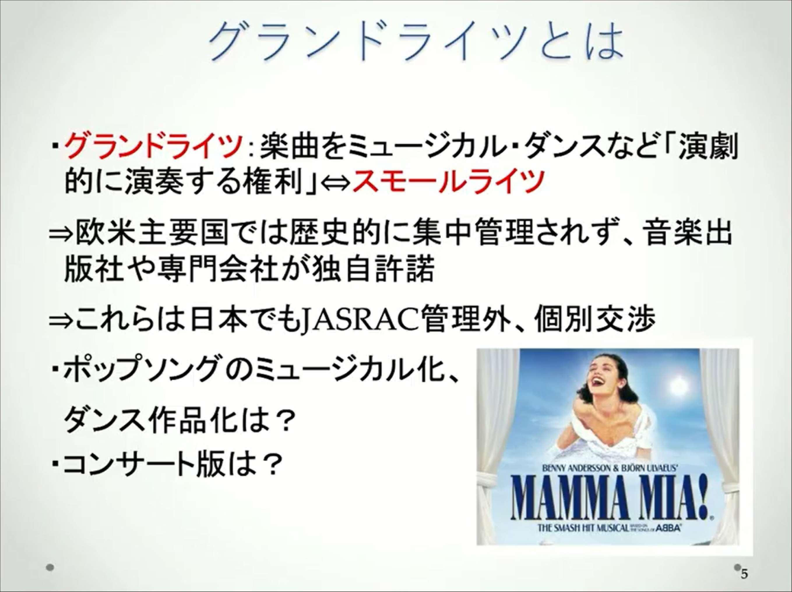 ただし個別交渉が必要になる楽曲もあります。その代表が特定外国曲のグランドライツです。ミュージカルの楽曲などは、劇場やプロデューサーの独占許諾により他の団体が舞台で演奏できない、個別管理が主流です。そうなるとJASRACでも許可できないので、個別交渉が必要になり、時に高額な使用料が必要になります。